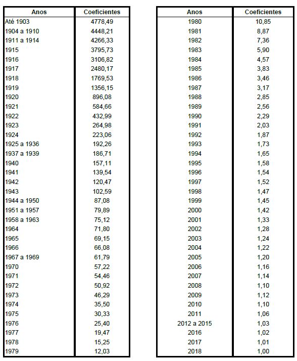 Os coeficientes de atualização monetária a utilizar constam da Portaria n.º 400/2015, de 6 de novembro.